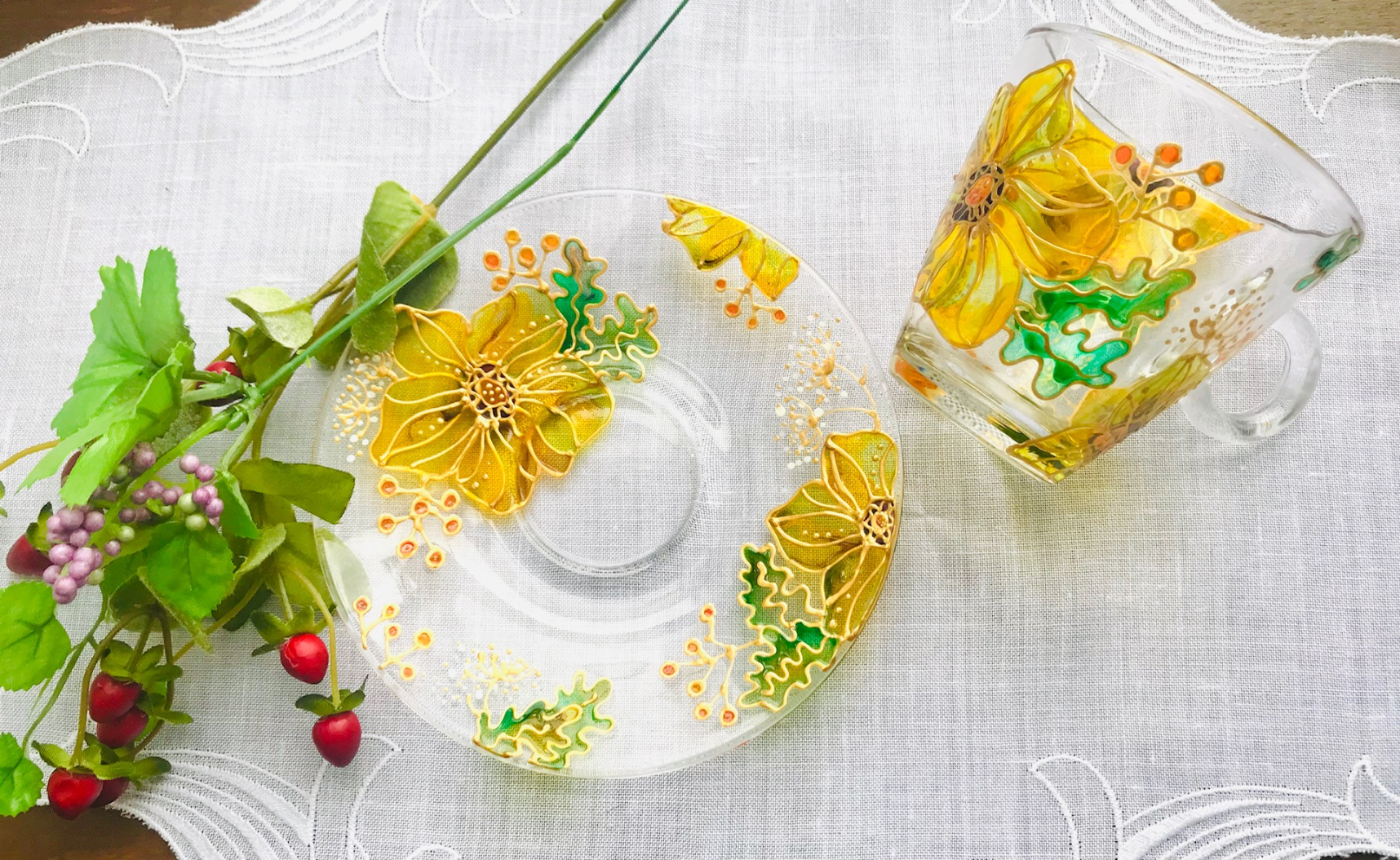 ご家庭のオーブンで焼成できる、ガラス用絵具です。お花はカップとソーサーに最低一つずつペイントします。時間の許す限りお好みで好きなだけ描いてみましょう♪