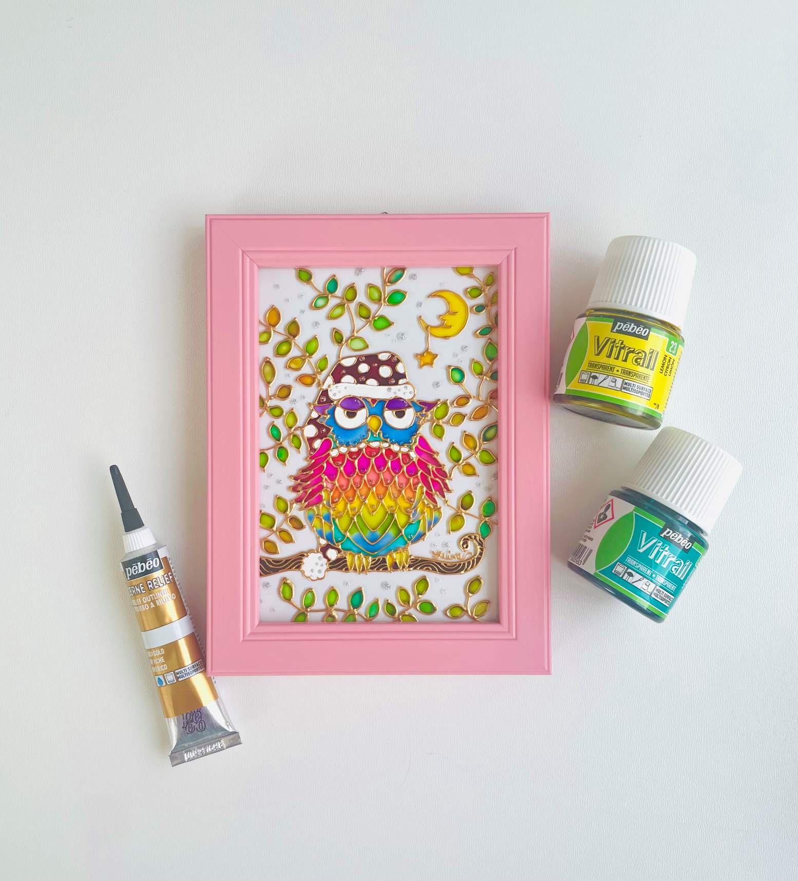 南フランスのガラス絵の具ヴィトラーユを使い幸福を呼ぶフクロウをペイントします。