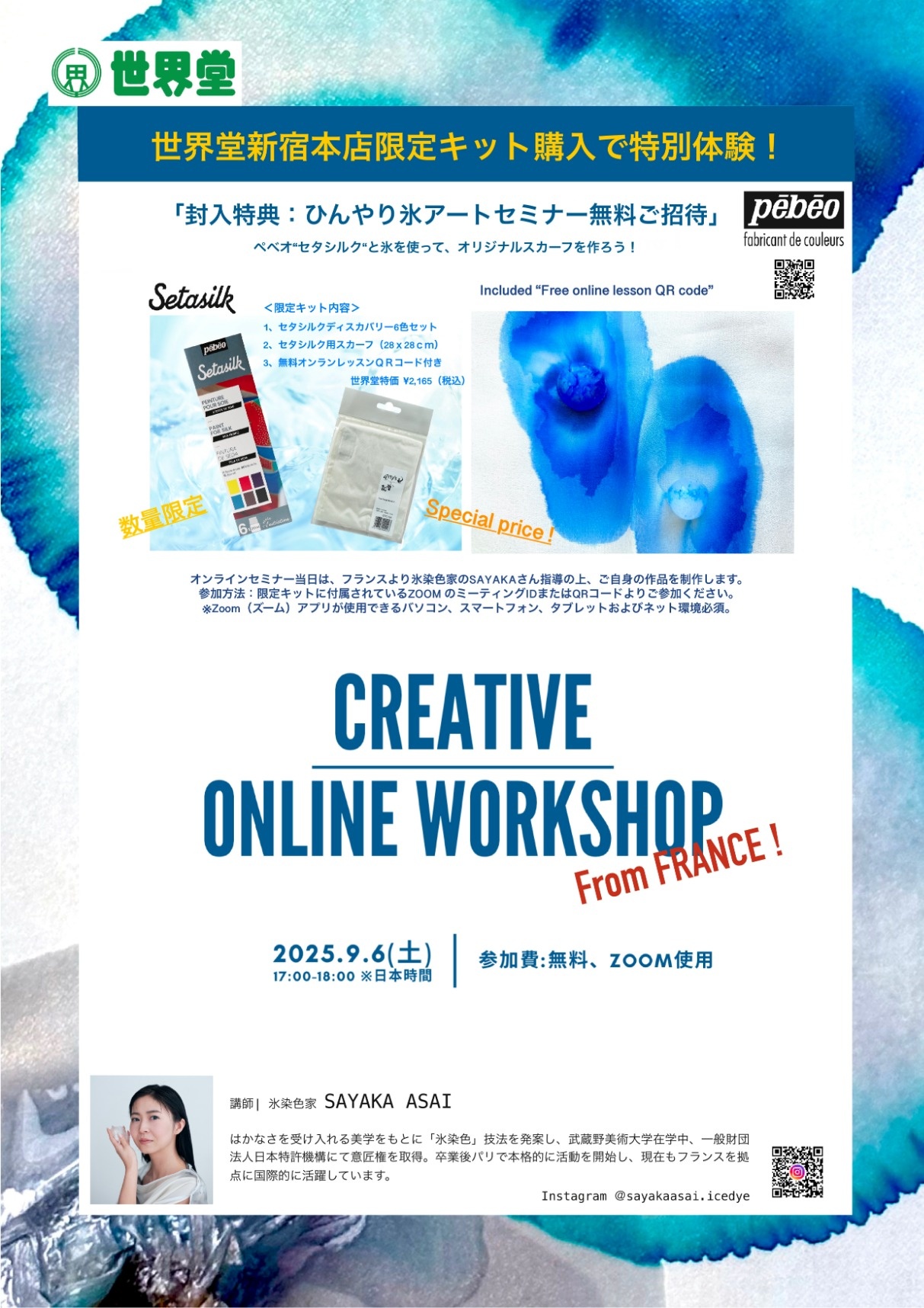 オンラインセミナー当日は、フランスより氷染め作家Sayakaさん指導の上、ご自身の作品を制作します。