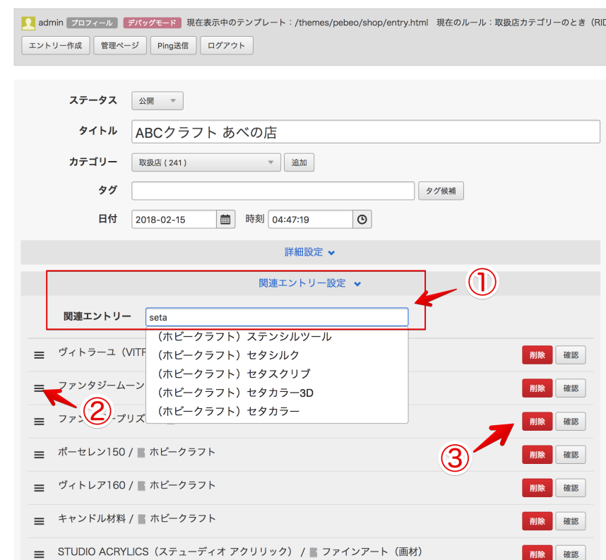 - 関連エントリーの欄「1」に、商品名または、ファイル名をタイプします(※一部を打つだけで該当ページのタイトルがリストされます。画像の例では「seta」とタイプしています)