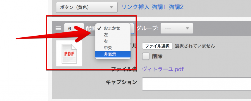 ファイルのアップロードでPDFをアップロードしてから、「おまかせ」を「非表示」にします。