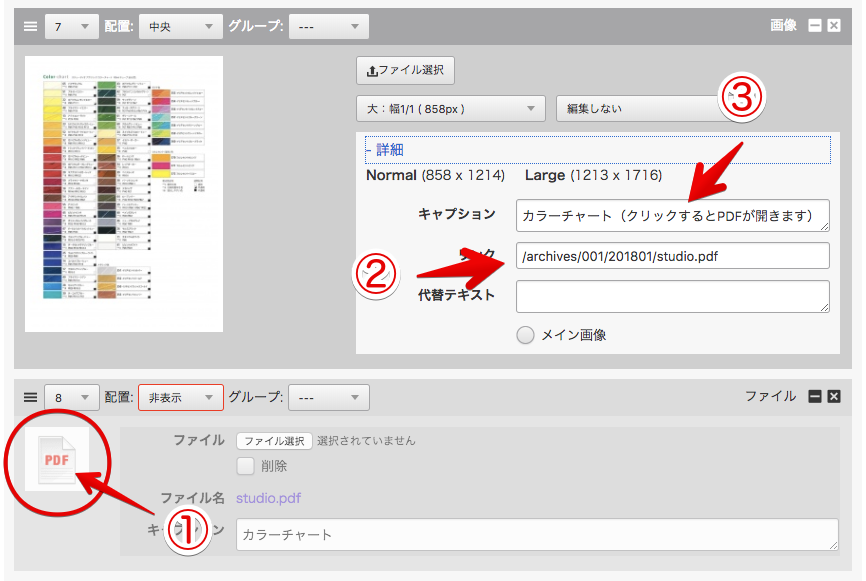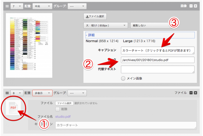そのときに、設定を「大」と「中央」にして、詳細を開き、リンクの部分に先ほどコピーしたPDFのアドレスをペーストします。