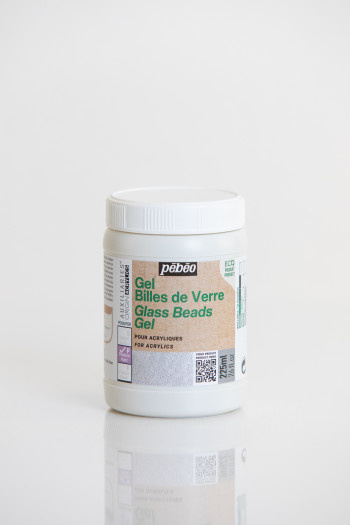 ガラス製の微小な球状の粒が入った透明ジェルで、乾燥後、ひび割れしない凹凸のあるレリーフ効果が得られます。メディウム単独での使用、アクリル絵具との混合、メディウムの乾燥後、上からアクリルでの着彩も可能です。